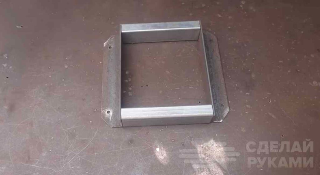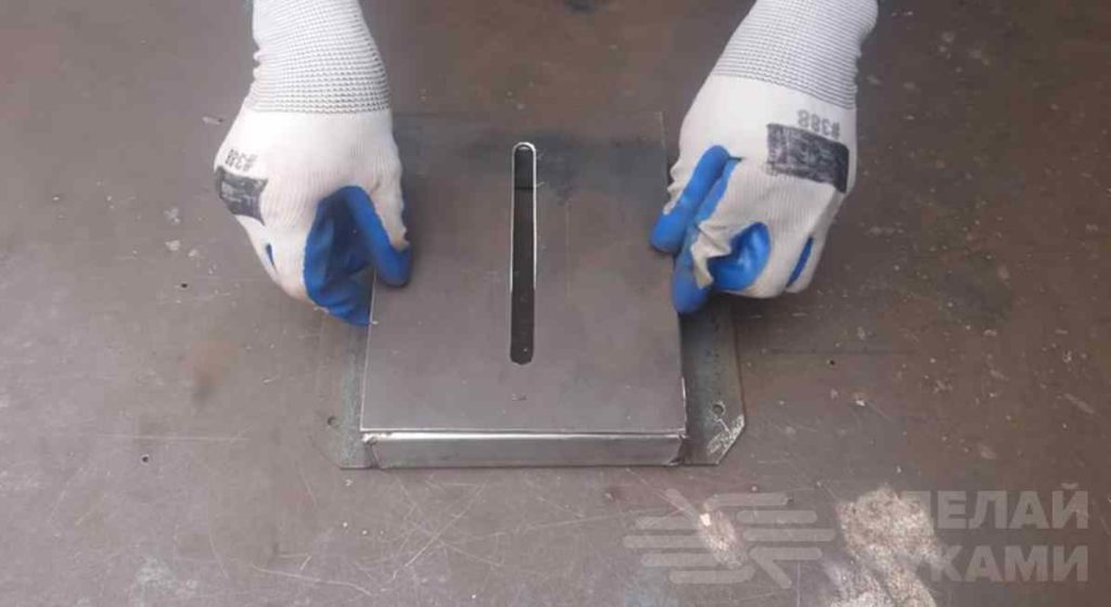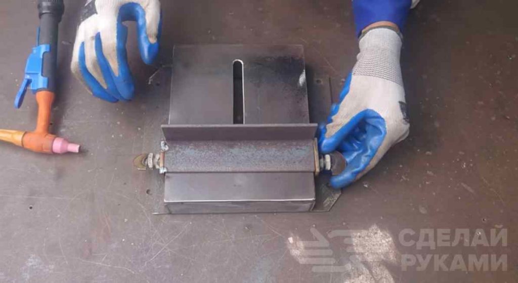 Из листового металла вырезаем кусок пластины по размеру ранее изготовленного основания и прорезаем по центру паз. Затем привариваем заготовку к основанию.