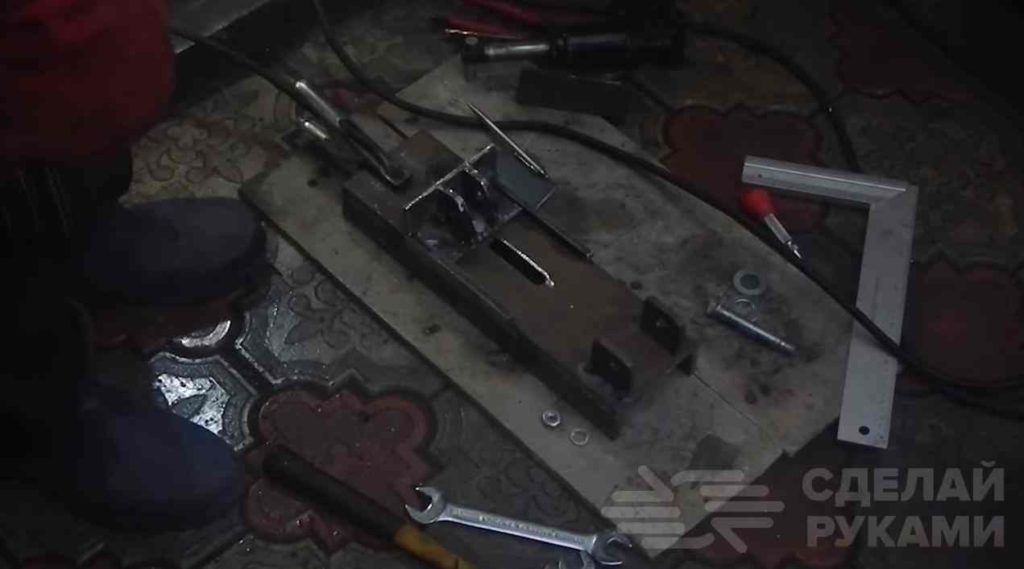 Устанавливаем домкрат и размечаем места приваривания ушек. Одно из ушек нужно установить на неподвижной губке в виде углового упора.