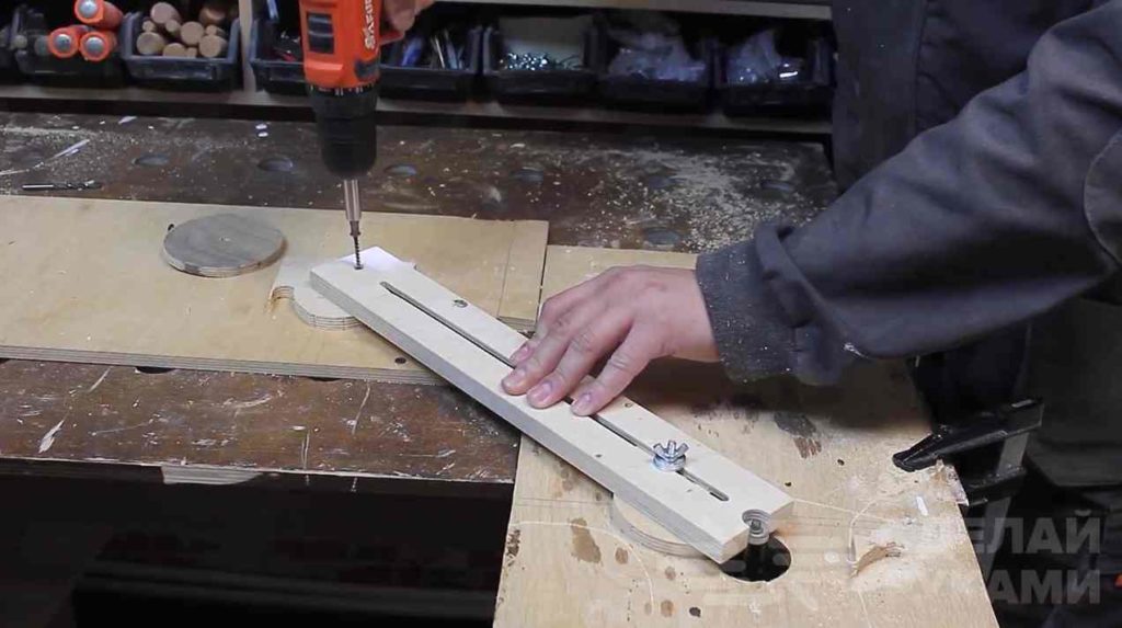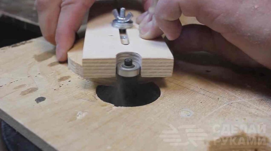 Например, одним из полезных самодельных приспособлений является циркуль для фрезера. Используя эту оснастку, можно быстро вырезать ровные круги нужного диаметра из фанеры или дерева.