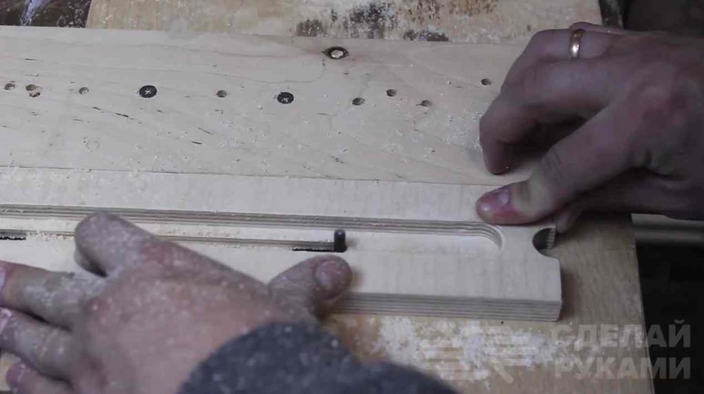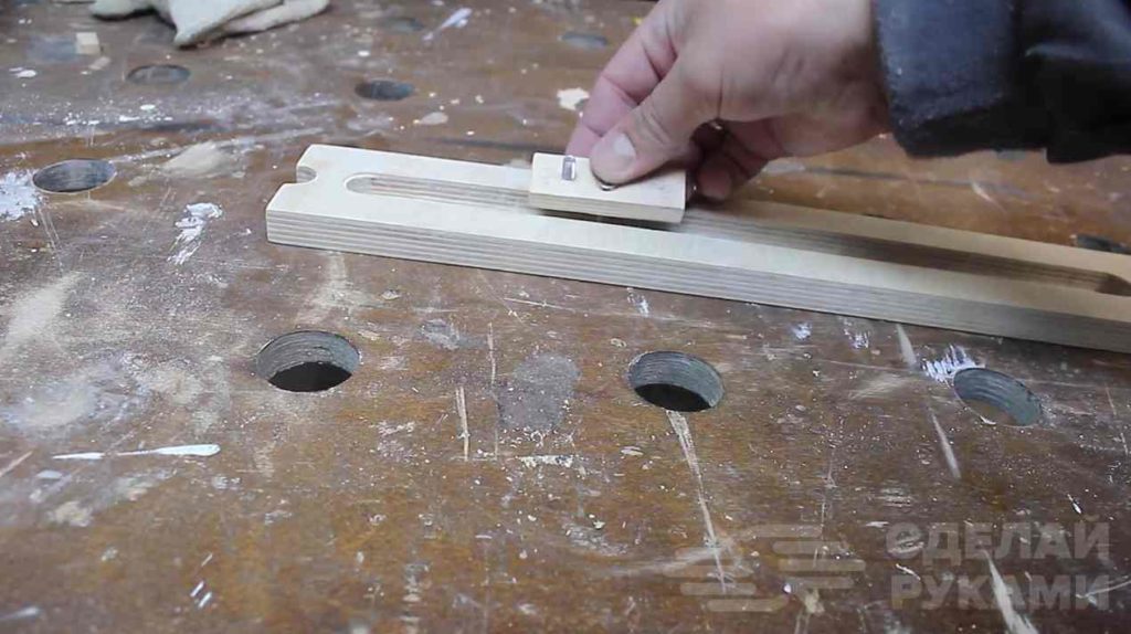 После этого из отрезка фанеры нужно изготовить ползун, который будет перемещаться внутри паза. Фиксируем его с помощью винта с гайкой.