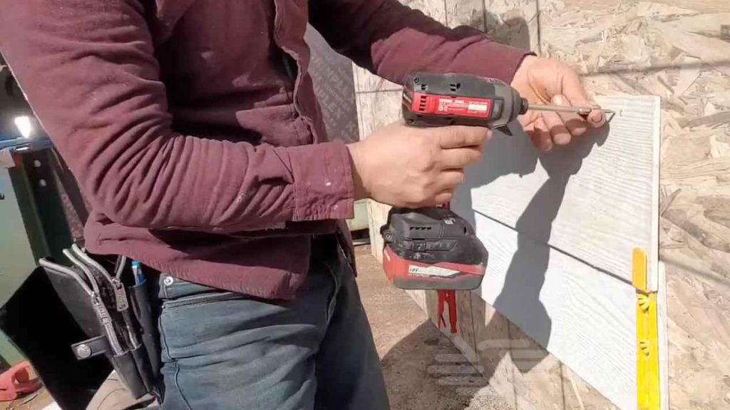 Сборка осуществляется снизу-вверх. Для такой работы обычно нужно два человека, но автор видео предлагает инструмент, который позволит облицовывать таким способом стены одному человеку.