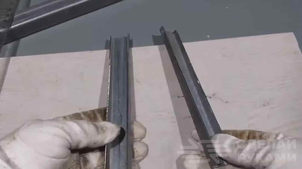 Для начала необходимо отрезать кусок необходимой длины от квадратной трубы. Разрезаем по всей длине с двух сторон данный отрезок. Далее стачиваем примерно от середины всей длины обе полки.