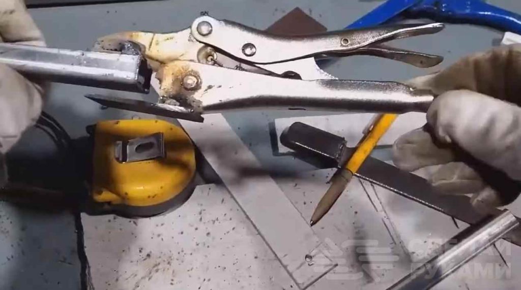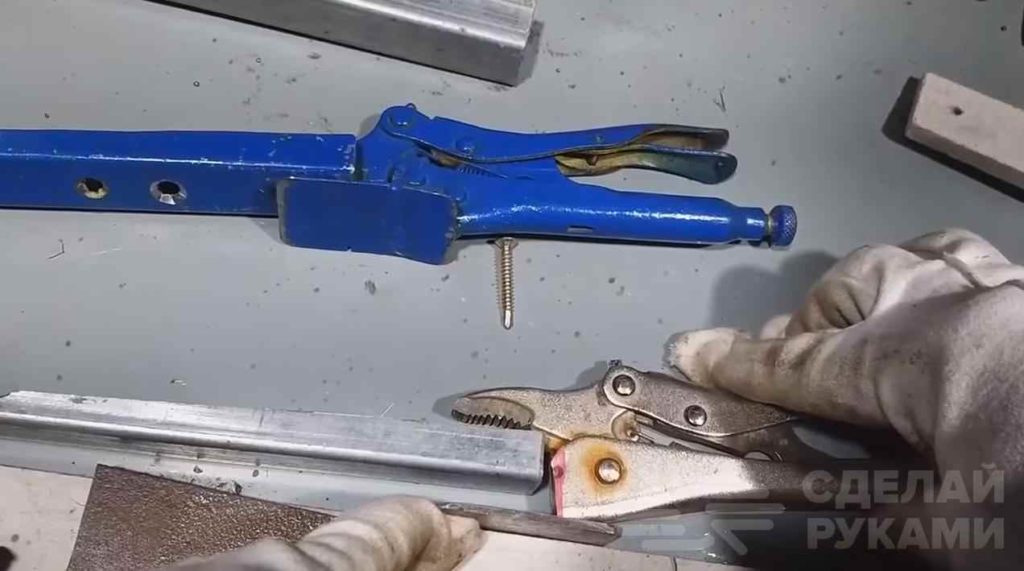 Для изготовления самоделки понадобятся следующие материалы: квадратная профильная труба, полоса металла, ручные зажимные клещи, а также пара болтов с гайками барашками.