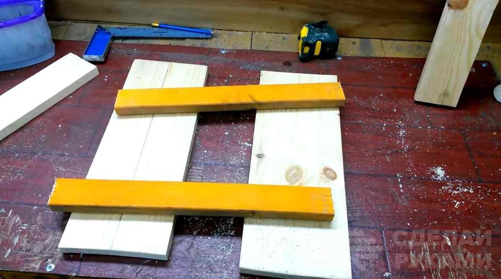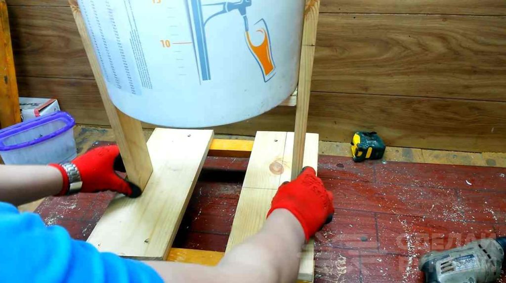 Из отпиленных по размеру досок автор изготавливает две стойки, которые соединяются между собой перемычкой. На эту перемычку будет опираться пластиковое ведро.