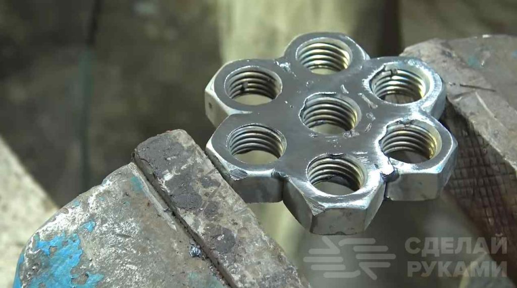 Соединяем две шестеренки вместе, и вкручиваем в центральную гайку длинный болт. Еще два болта вкручиваем по краям, и все лишнее — отрезаем. Фиксируем при помощи сварки.