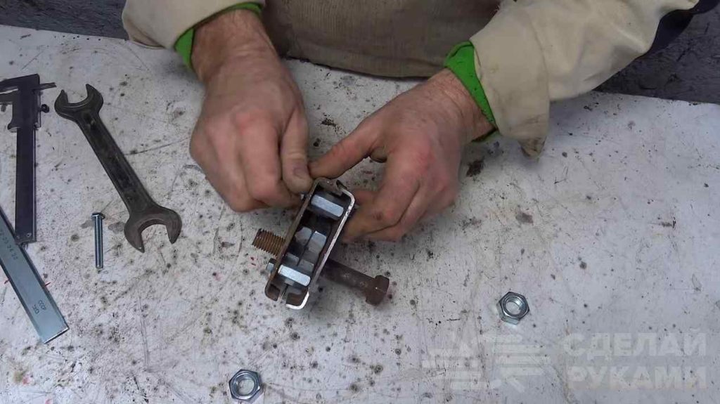 На следующем этапе из листового металла автор вырезает две пластины и делает из них корпус, внутри которого находится шестеренчатое колесо из гаек. Длинный болт в центральной гайке выступает в качестве вала.