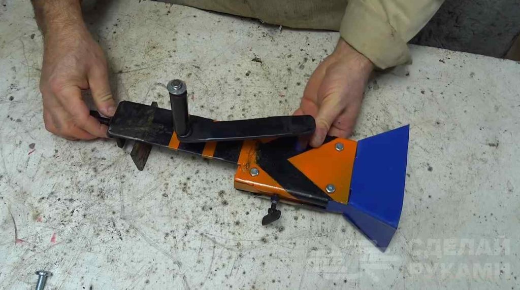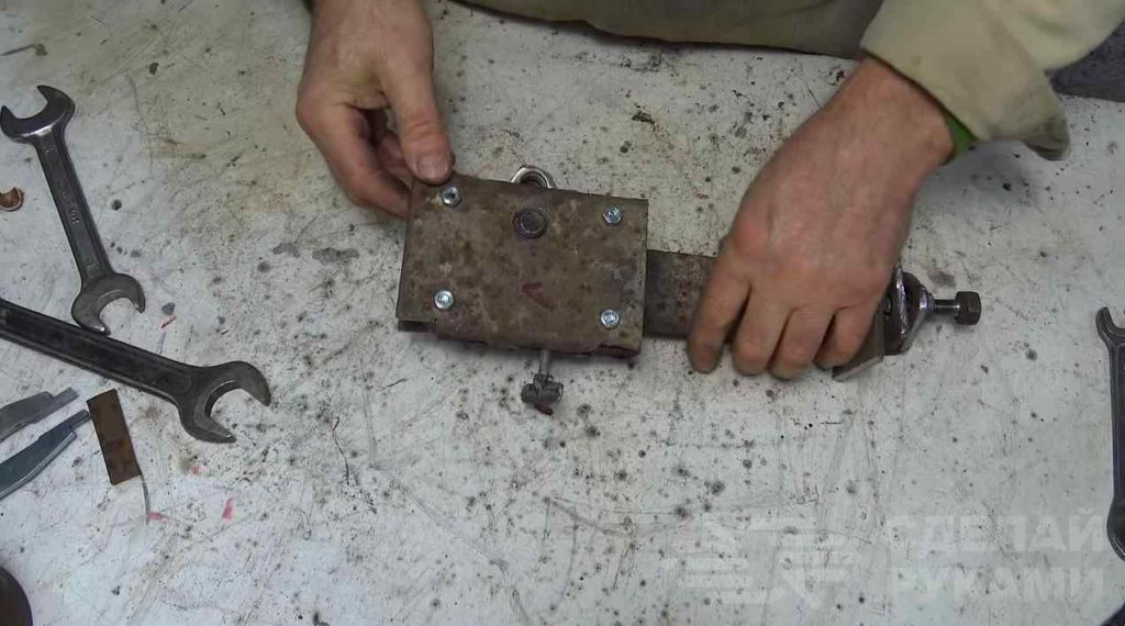 Далее к корпусу орехокола привариваем кусок полосы металла, в нижней части которого нужно будет закрепить самодельную струбцину (как на мясорубке) для фиксации к столу.