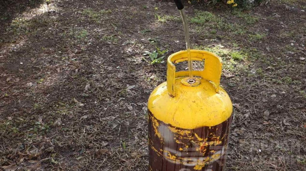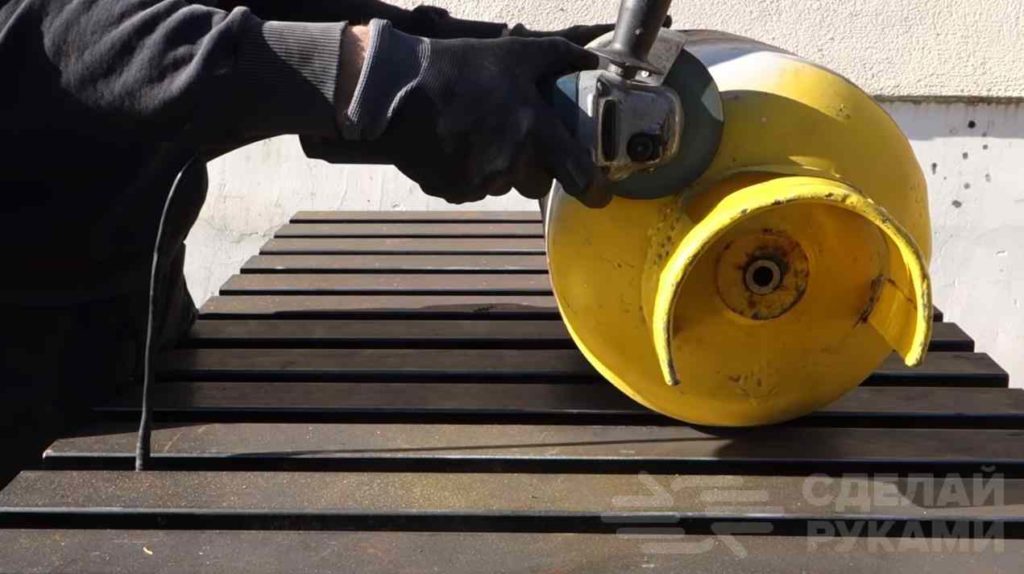 Прежде чем резать баллон болгаркой и сверлить в нем отверстия, необходимо убедиться, что внутри отсутствует пропан, а также слить из него газолин. Затем надо заполнить баллон водой и ополоснуть его несколько раз.
