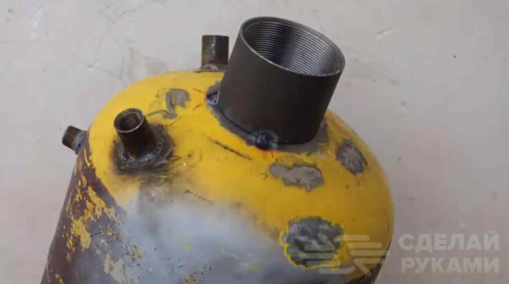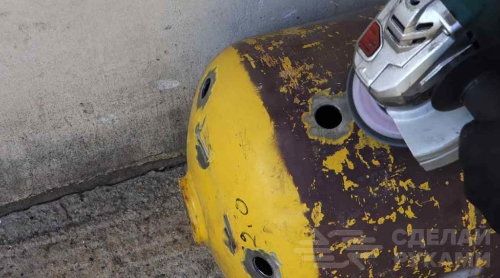 Далее автор сверлит в баллоне отверстия под резьбовые соединения. Участки металла вокруг отверстий надо зачистить, чтобы можно было качественно приварить соединительную арматуру.