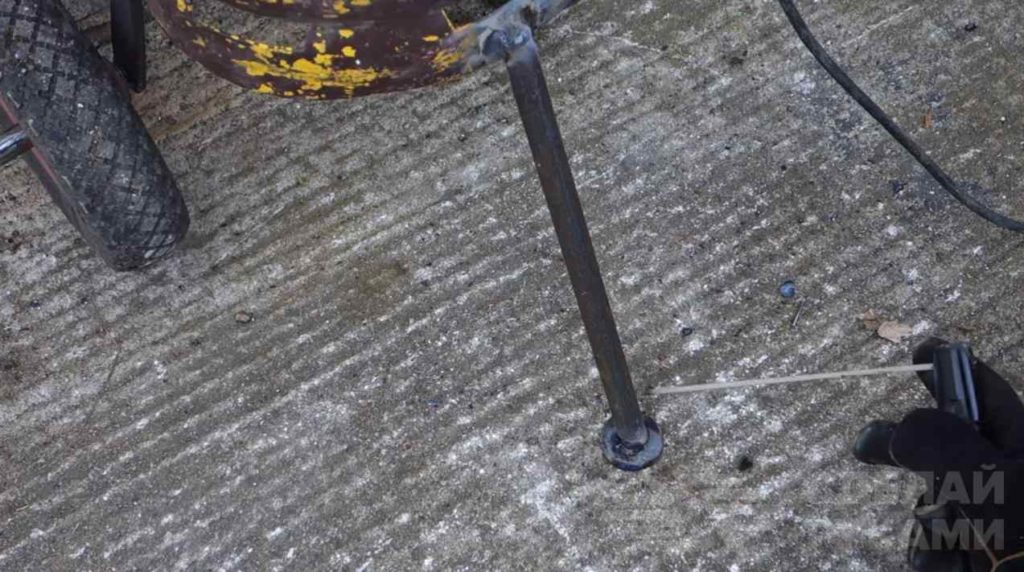 На следующем этапе автор приваривает к нижней части баллона две стойки из профильной трубы, к которым крепятся колеса. Также надо будет приварить опорную ножку спереди.
