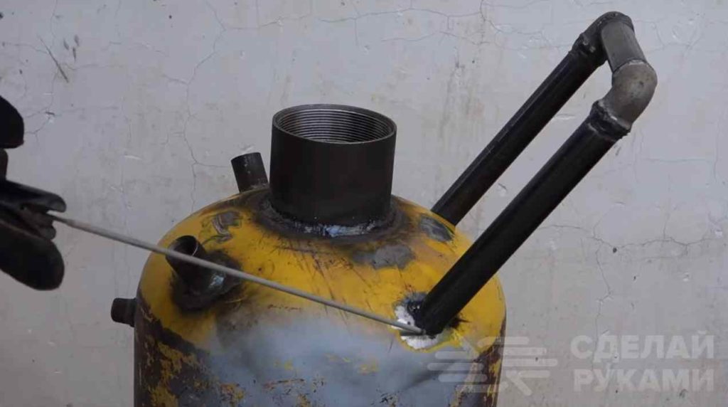 В верхней части пропанового баллона необходимо вырезать отверстие, а потом приварить «горловину». Из отрезков стальных труб и уголков автор собирает ручку и приваривает ее к баллону.