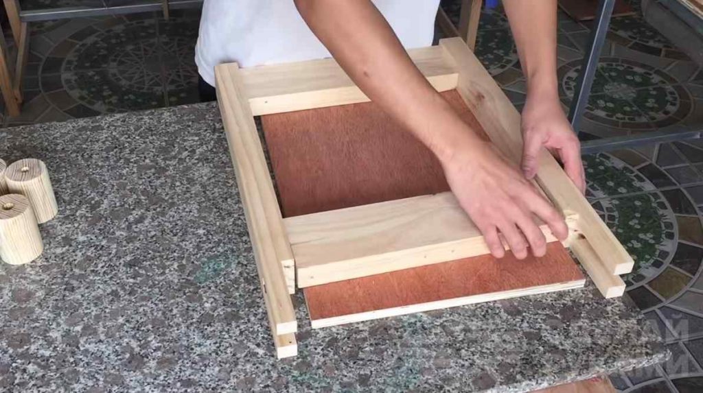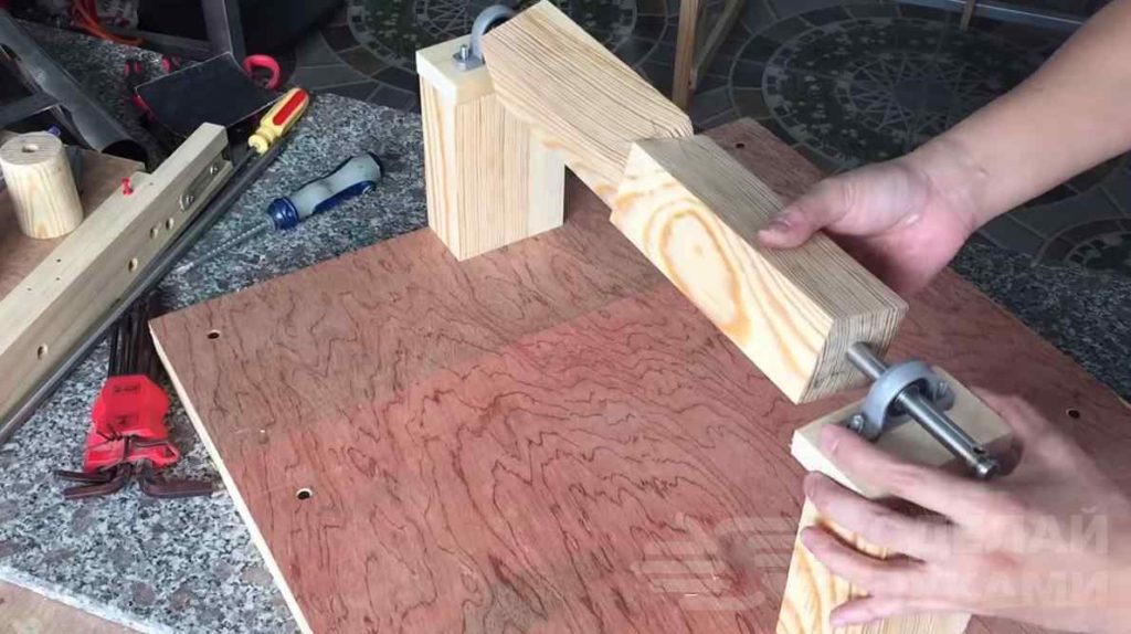 Из большего по размеру куска фанеры, чем подающий стол, вырезаем прямоугольную заготовку и прикручиваем к её краям два бруска – это будут ножки. Переворачиваем и устанавливаем на один край вертикальный брусок.