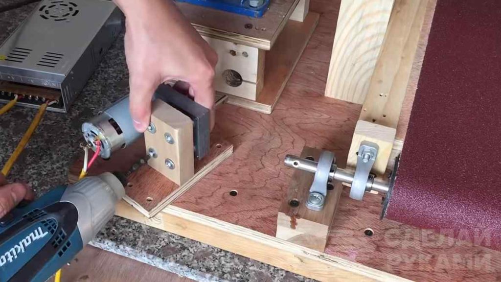 Соединяем его со шлифовальным валом и проверяем работоспособность. Малый двигатель для прокручивания ведущих роликов устанавливаем рядом и соединяем с нижним валиком.