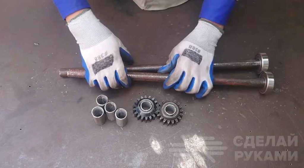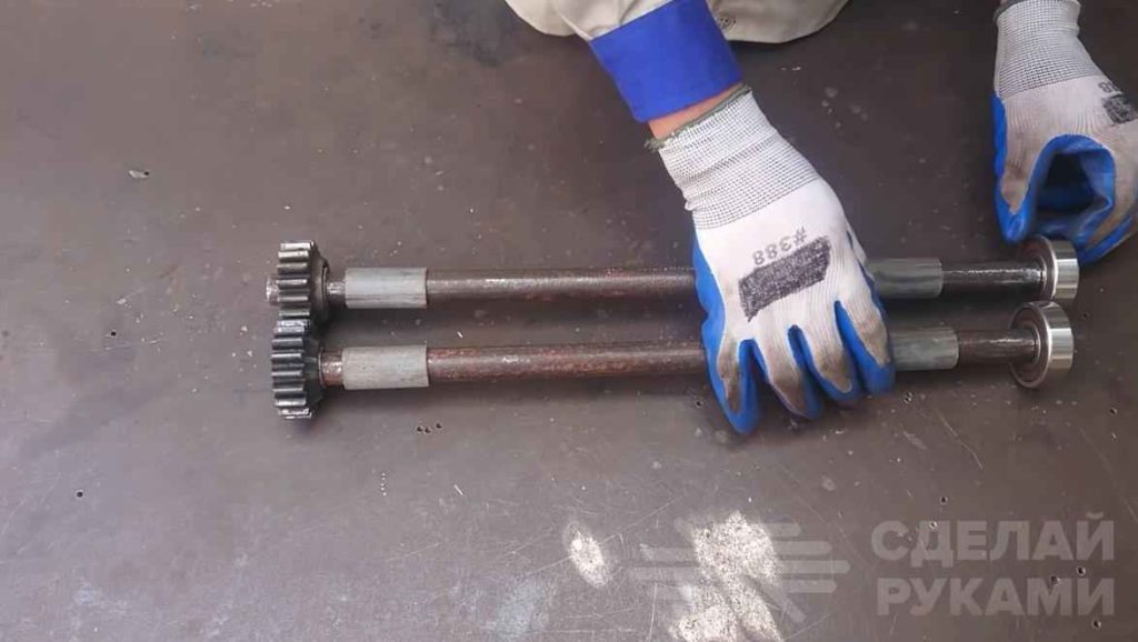 Для изготовления валов возьмём небольшой кусок арматуры и отрежем два куска различной длины (разница чуть больше, чем толщина подшипника для продавливания). На один край закрепляем подшипники, а на обратный две шестерни для соосного вращения.