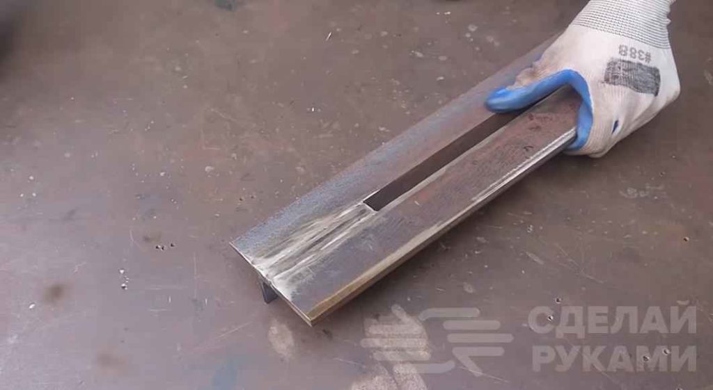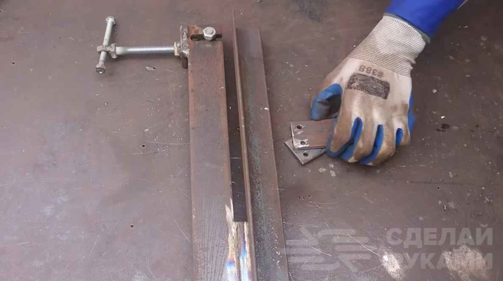Точно такой же длины отрежем и уголок. Между ними с одного края приварим небольшую полоску металла, чтобы разделить небольшим расстоянием наши заготовки. Свариваем всё вместе согласно плану.