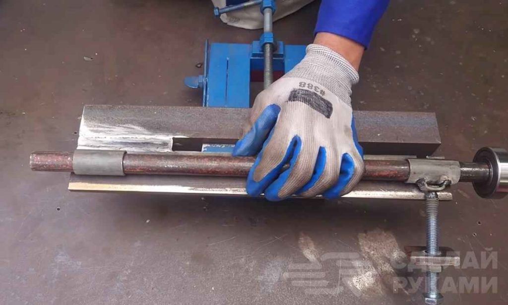 Из кусочка трубы с внутренним диаметром, равным диаметру вала, вырезаем четыре втулки. Одеваем их на наши валы. На одну втулку привариваем болт для центрирования. И привариваем болт для регулировки давления на лист.