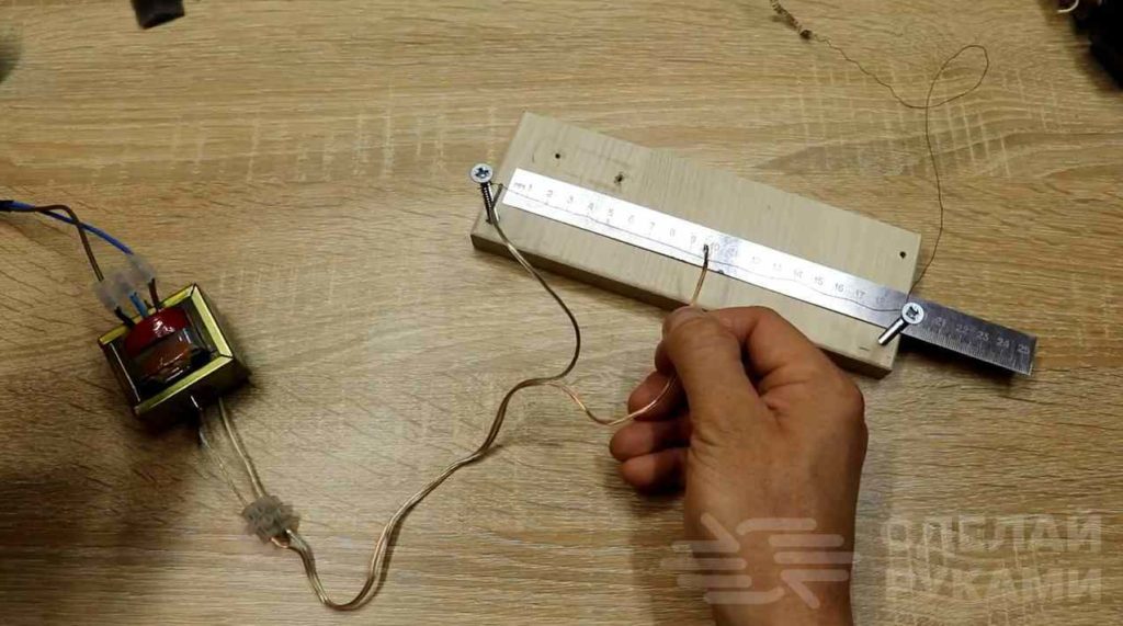 Далее необходимо будет опытным путем определить подходящую для работы длину нити. Для этого из куска ДСП и двух саморезов автор собрал небольшой стенд. Между саморезами натягиваем нихромовую нить.