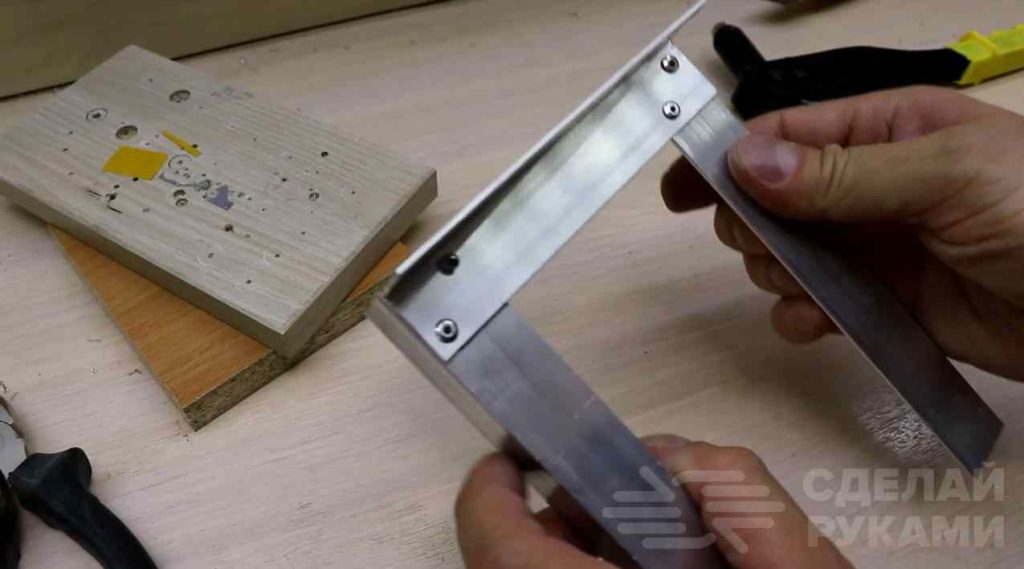 Для изготовления самой рамки мастер использует алюминиевый уголок размером 25*25 мм и толщиной 2 мм. Отрезаем заготовки нужной длины, и потом собираем их на заклепки. Примеряем рамку на свое место.