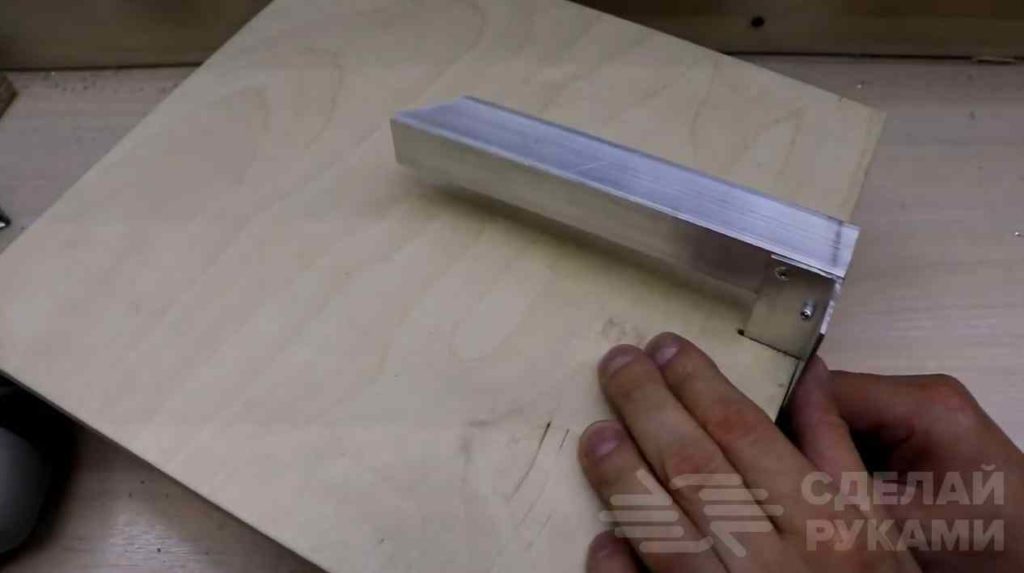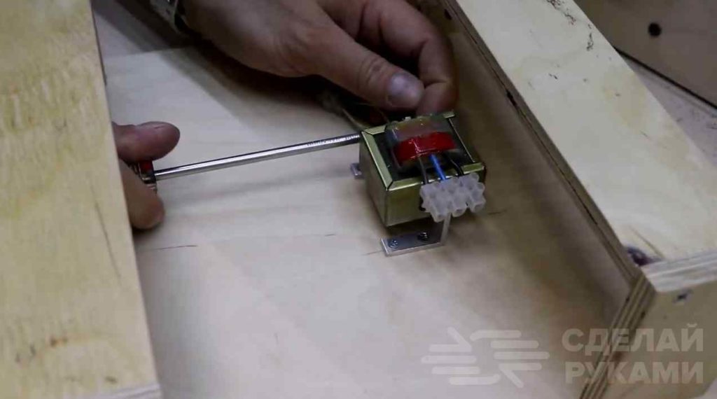 На следующем этапе отрезаем два алюминиевых уголка. Прикручиваем их под столешницей. К ним крепим понижающий трансформатор.