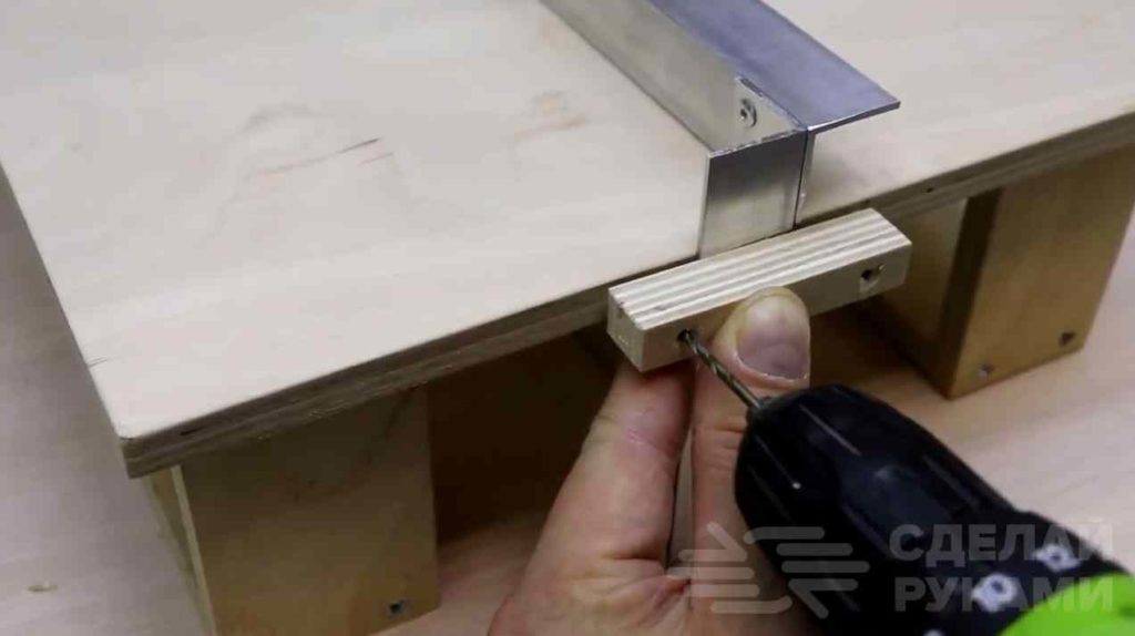 Сверлим крепежные отверстия для крепления нихромовой нити. К столешнице изготовленная П-образная рамка будет крепиться при помощи небольшого отрезка фанеры. Но не сейчас — чуть позже.