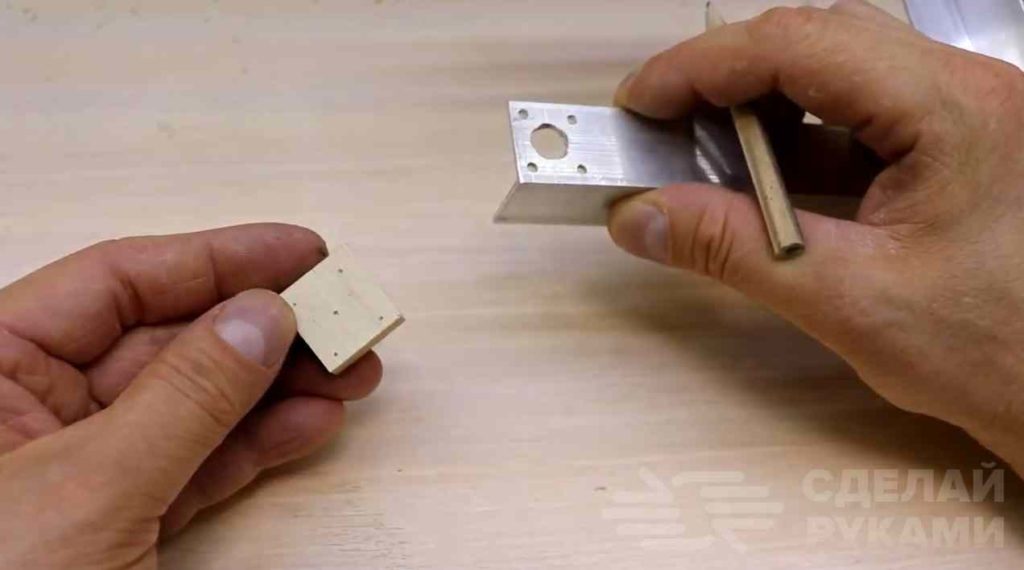 Размечаем и сверлим в одной из заготовок необходимые для монтажа отверстия. В середине квадратика нужно просверлить отверстие под болт М5, к которому и будет крепиться нихромовая нить.