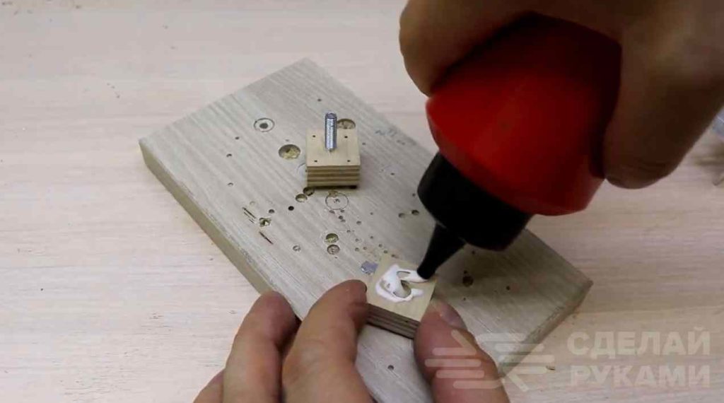 Во второй заготовке делаем углубление под шляпку болта. Потом склеиваем обе заготовки столярным ПВА, стягиваем струбциной. После полного высыхания надо сошлифовать остатки клея.