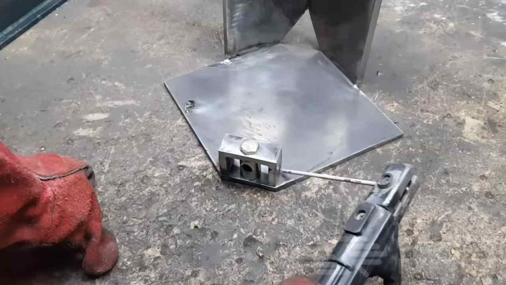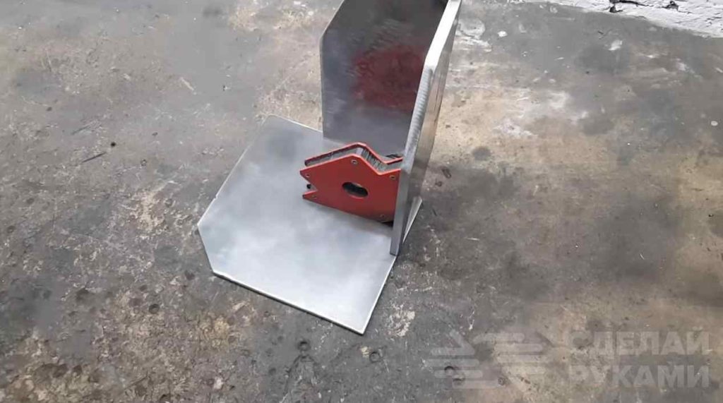 Опорную площадку вырезаем из металлического листа со срезанными углами. Устанавливаем боковые стенки вертикально на пластину и привариваем, также соблюдая угол 90 градусов.