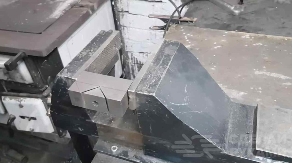 По её торцам привариваем две металлические пластины. Теперь изготовим верхний фиксатор. Вырезаем из металлического бруска необходимую форму прижима и также фиксируем её на втором винте, который был подготовлен заранее.