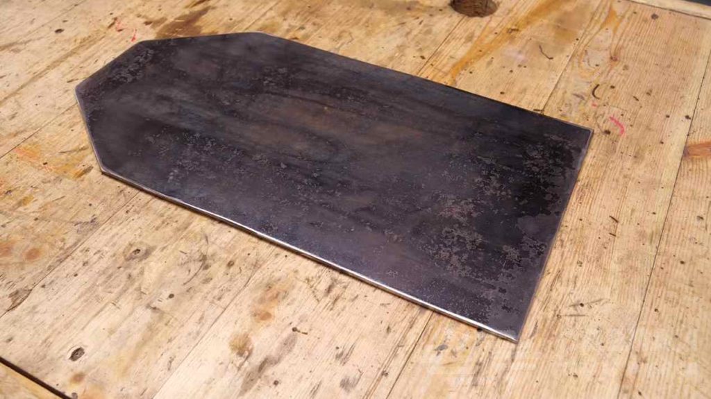 Первым делом из листового металла толщиной примерно 4-5 мм вырезаем верхнюю часть станка — рабочий столик. При необходимости зачищаем его от ржавчины.