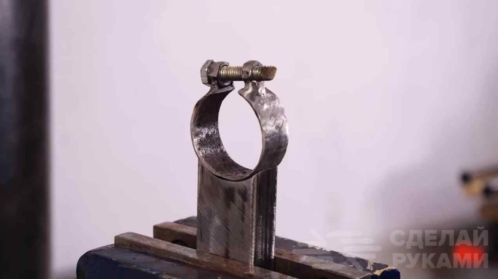 На следующем этапе из куска круглой трубы, двух гаек и болта автор изготавливает простой самодельный хомут для фиксации дрели. Привариваем его к отрезку профильной трубы.