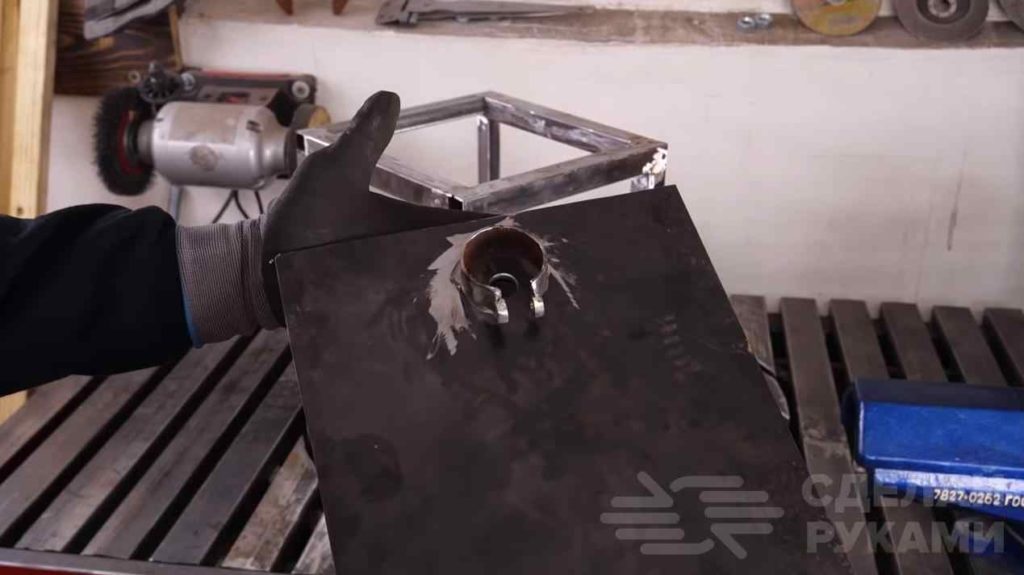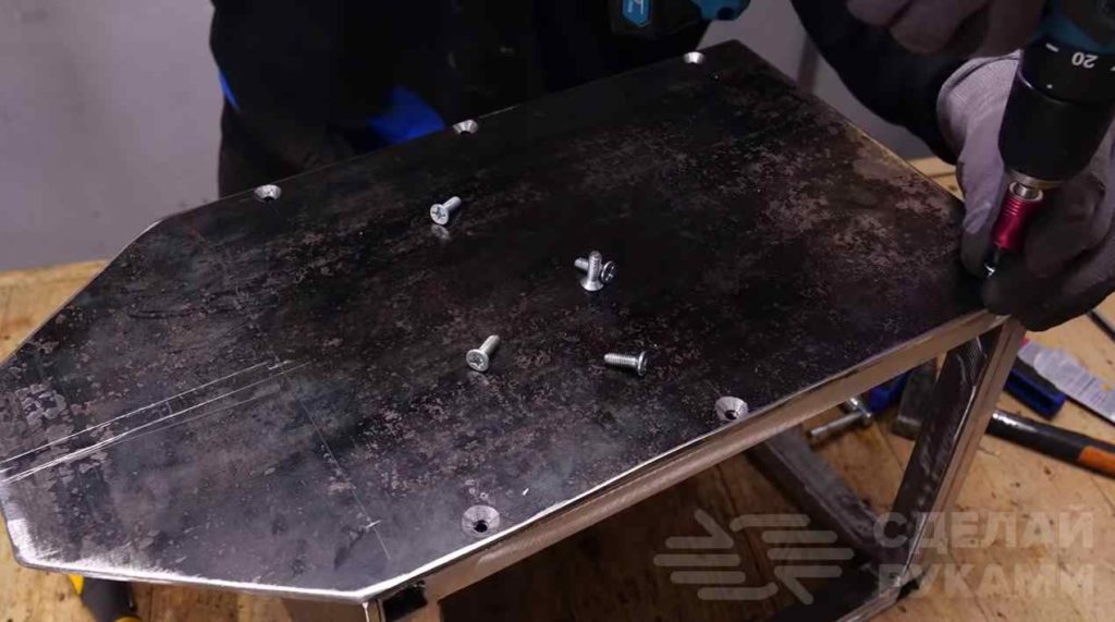Эту пластину привариваем к каркасу. Сам рабочий столик крепим при помощи винтов. Предварительно сверлим крепежные отверстия.