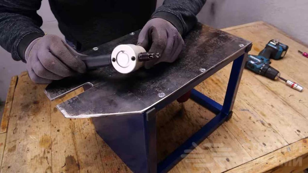 На последнем этапе вырезаем паз в передней части столика, затем крепим дрель и устанавливаем насадку «сверчок» для резки листового металла.