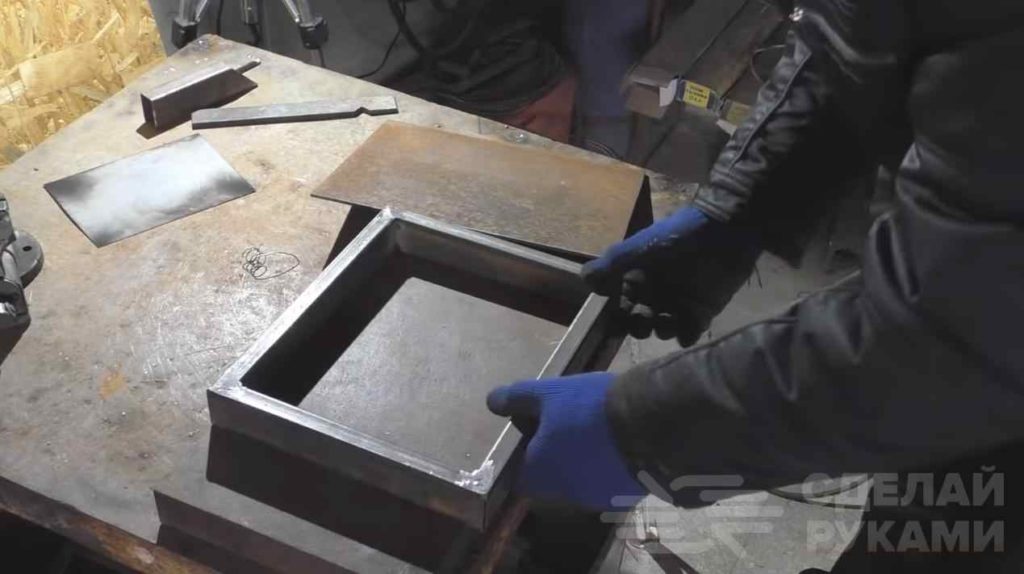 Первым делом отрезаем четыре куска профильной трубы 40*20 мм и свариваем прямоугольную рамку. К ней привариваем лист металла.