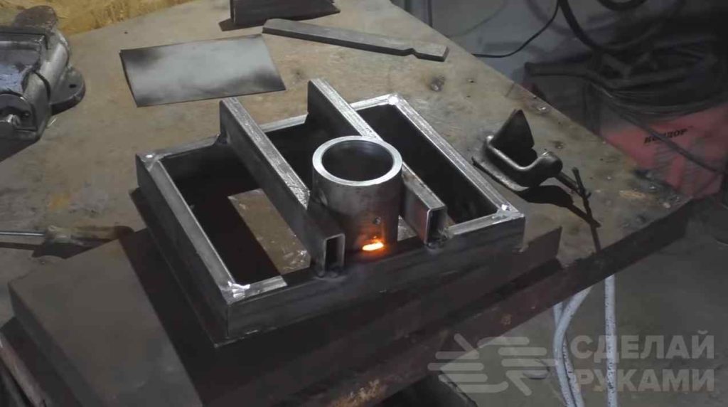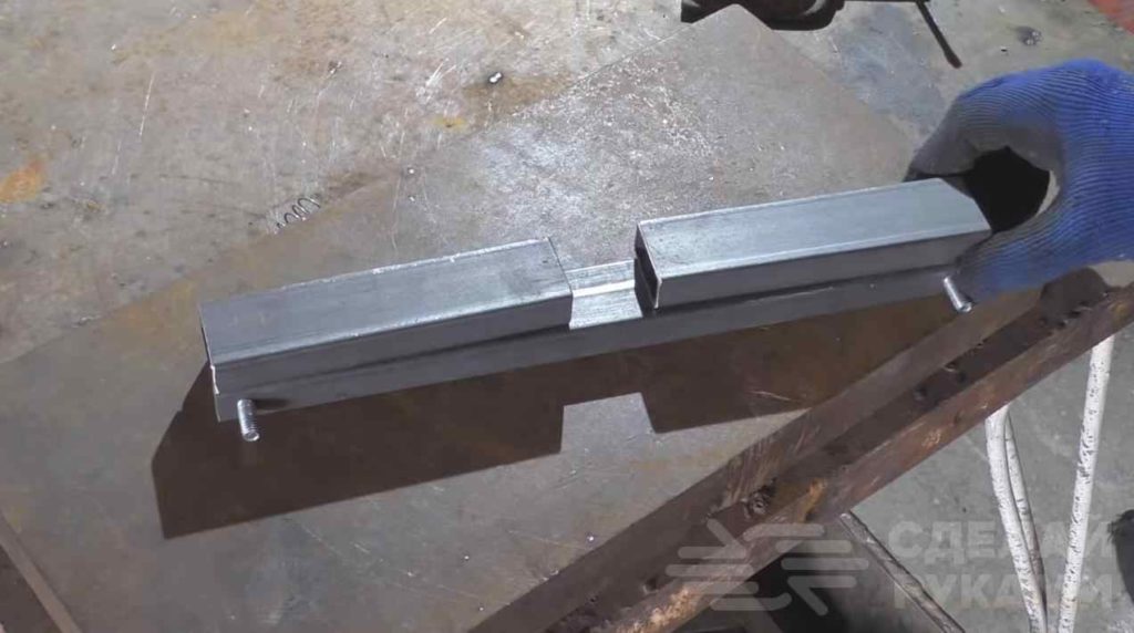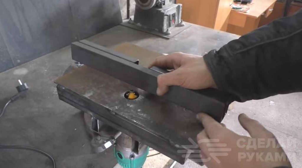 Из нескольких кусков профильной трубы автор сваривает направляющую, которую при необходимости легко закрепить на нашем самодельном столике.