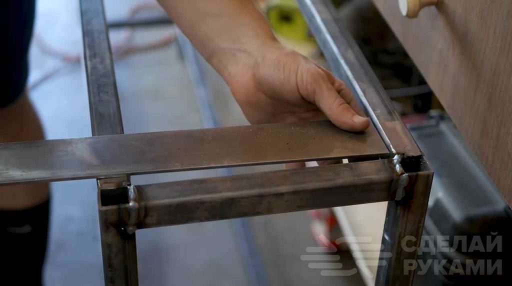 На следующем этапе в нескольких местах приварим пластины для крепления столешницы. Нишу под ящик будем делать из коротких отрезков трубы. Свариваем их под 90 градусов и привариваем внутри нашего каркаса.