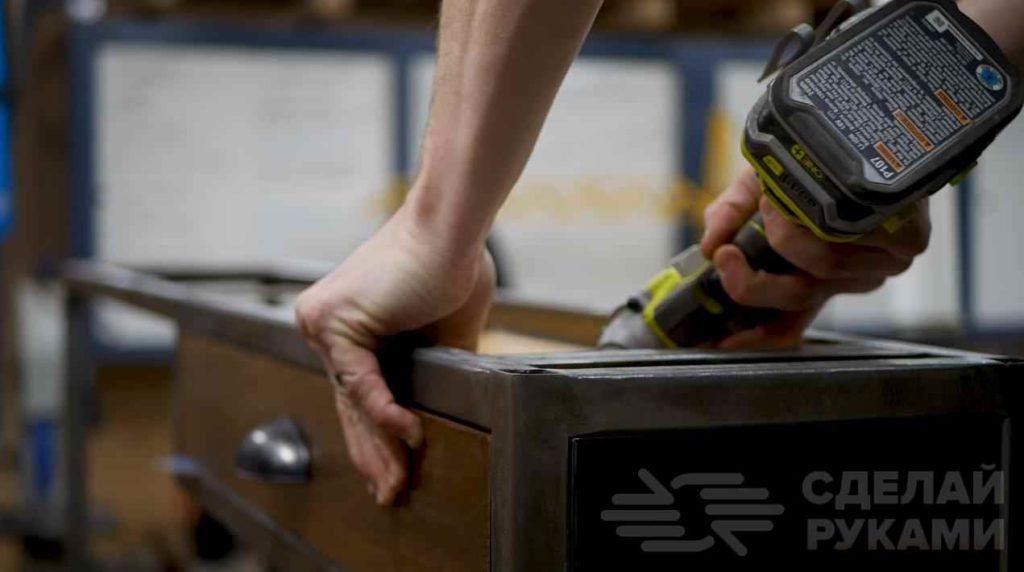Стенки ящика изготовим из листовой стали. Закрепляем на боковых стенках рельсы для ящика.