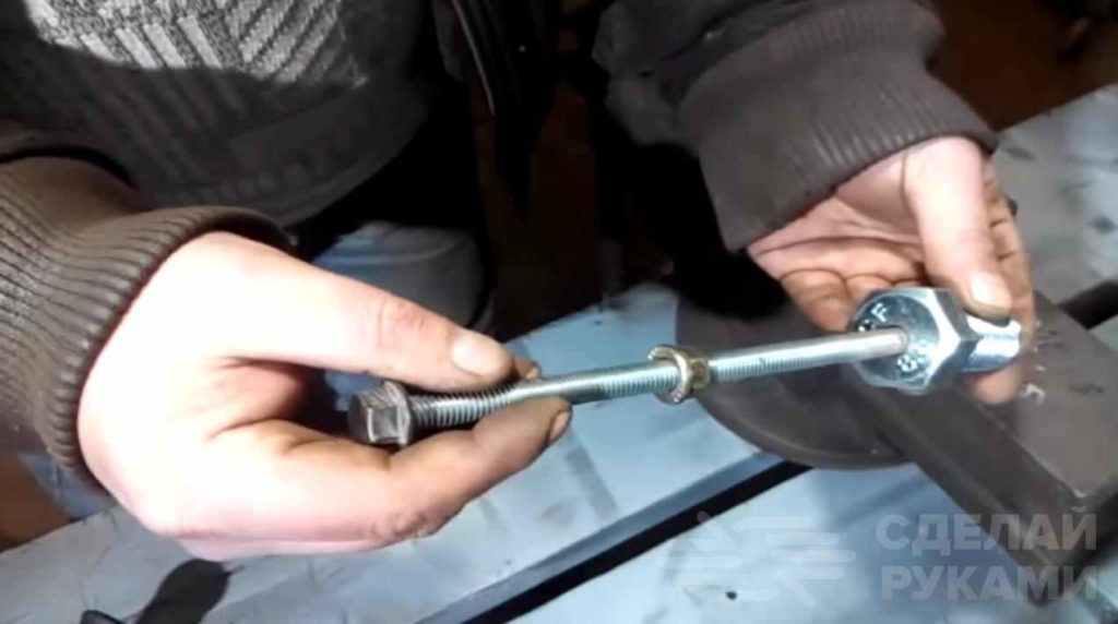 Чтобы сделать заклепочник, потребуется болт диаметром 20 мм и гайки к нему, и длинный болт диаметром 10 мм (тоже с гайками).