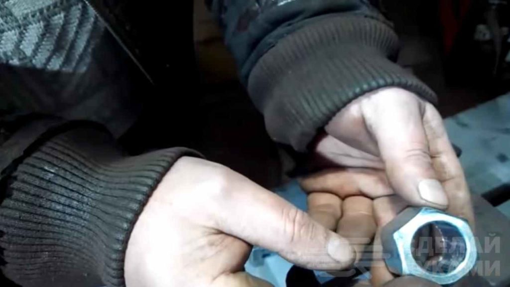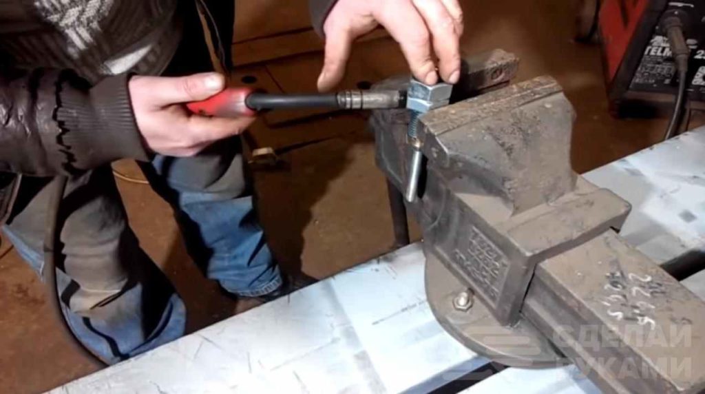 С помощью гаечного ключа выкручиваем большой болт из гайки с резьбой, приваренной к круглой трубе. В этот момент прокручивается подшипник и тянет болт М10, заклепка запрессовывается.
