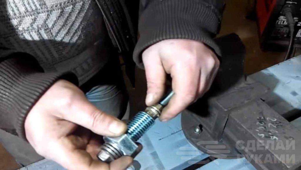 На следующем этапе к шляпке болта М20 привариваем гайку без резьбы. После этого на болт М20 накручиваем гайку с резьбой и привариваем к ней кусок круглой трубы. К другому концу трубы надо приварить шайбу.