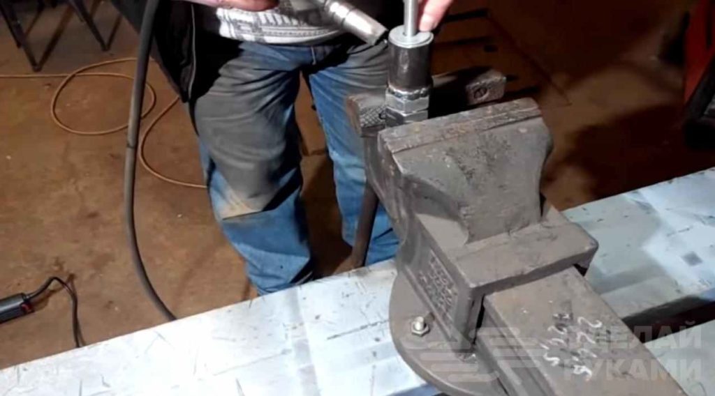 Затем останется только приварить к круглой трубе рукоятку из профильной трубы. Зачищаем сварные швы. Самоделка готова.