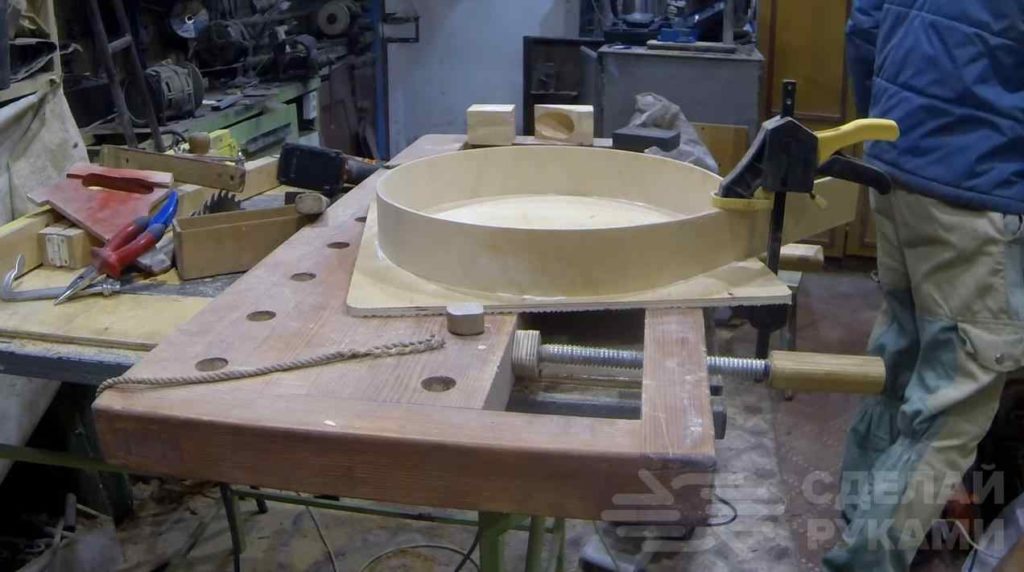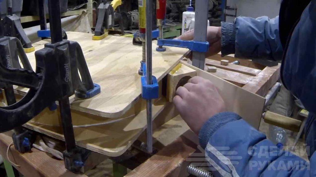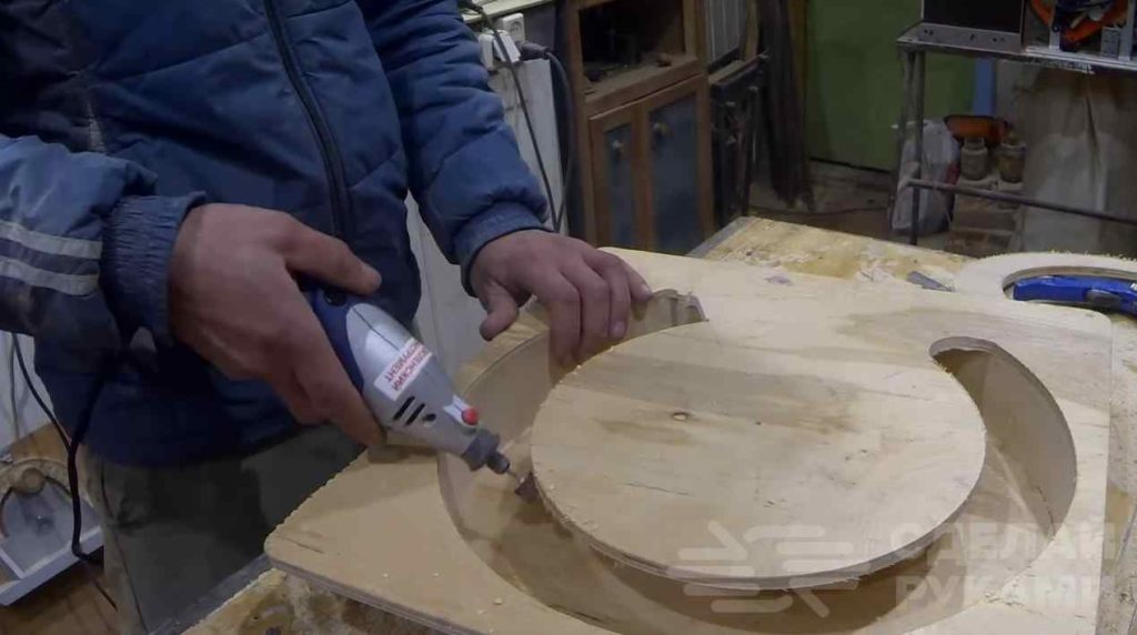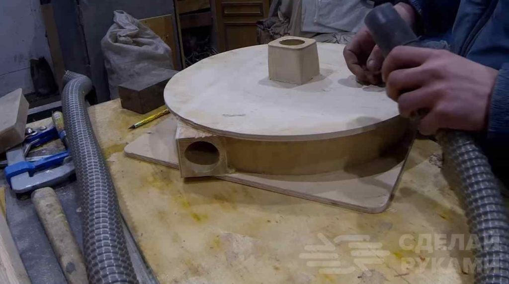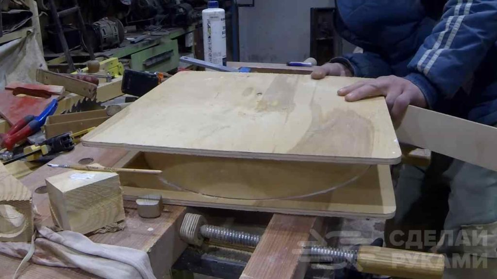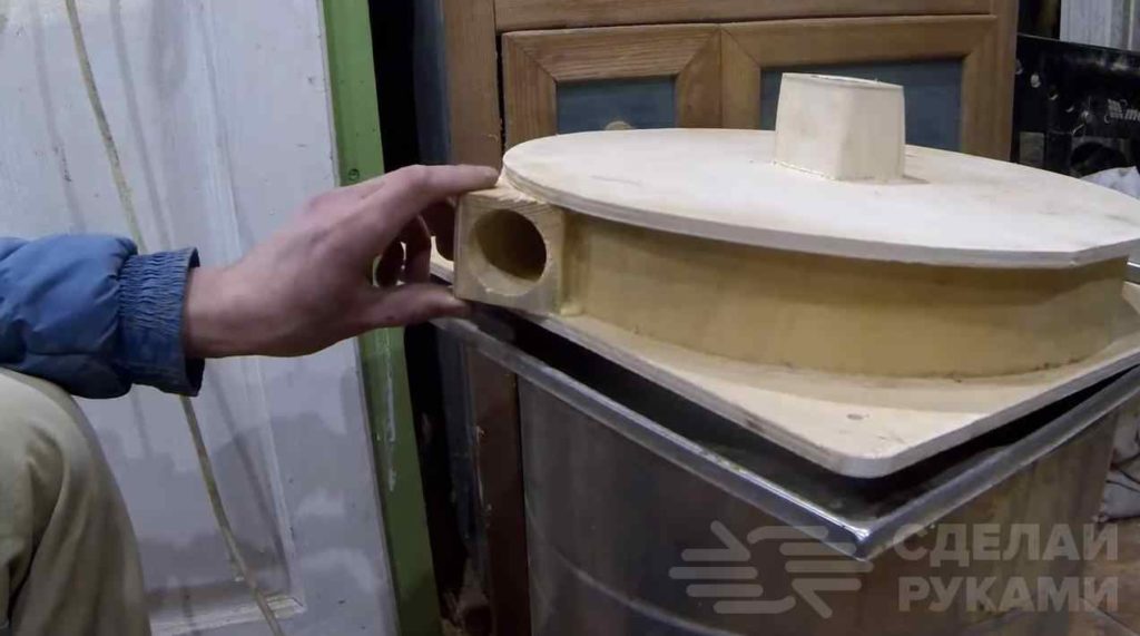 На следующем этапе вырезаем лист фанеры (размер листа должен быть таким, чтобы перекрывать верхнюю часть бака), делаем в нем паз и вклеиваем полосу фанеры, свернув ее кругом. Сверху приклеиваем крышку.