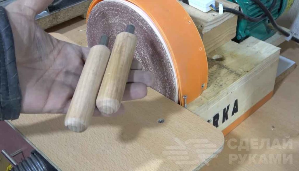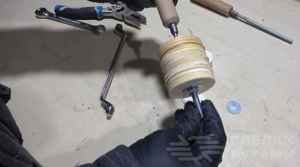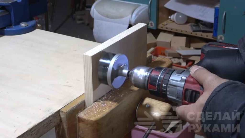 Устанавливаем на сверлильный станок нашу самодельную насадку и шлифовальной бумагой задаём идеальную форму круга, ошлифовывая все заусенцы и неровности.