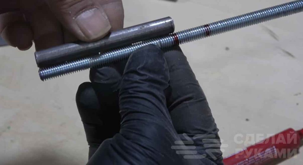 Теперь возьмём трубку большего диаметра, чем шпилька. Запрессовываем внутрь с двух сторон подшипники. Вставляем шпильку в трубку.