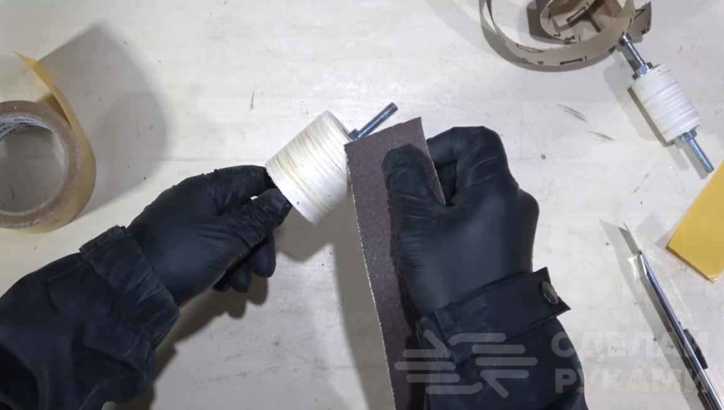 На двухсторонний скотч приклеиваем наждачную бумагу на барабан и фиксируем её края суперклеем. Закрепляем всё в патрон шуруповерта, и можно приступать к работе.