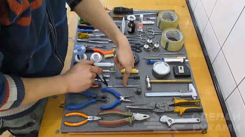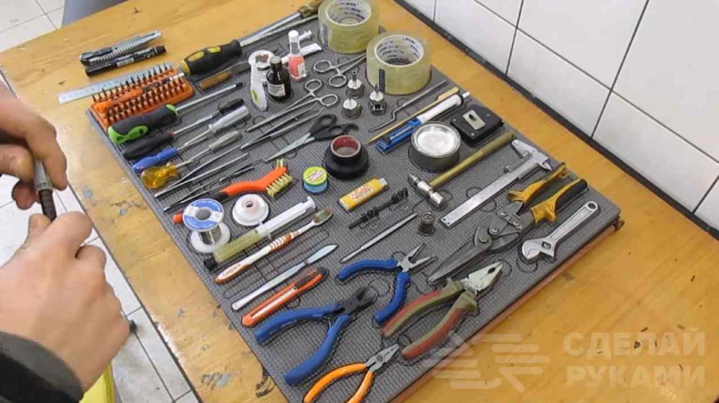 Первым делом на ровной поверхности необходимо расположить инструмент в том порядке, в каком вы хотите его видеть. Желательно сфотографировать его, чтобы не забыть, где и что лежит.