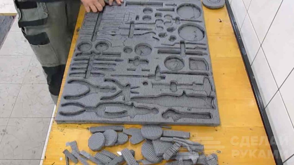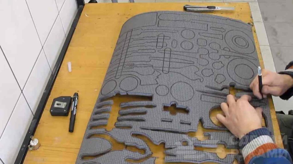 На следующем этапе необходимо отрезать подходящий по длине кусок коврика из пенополиэтилена. Располагаем на нем инструменты, и потом обводим их маркером.