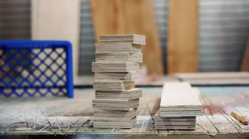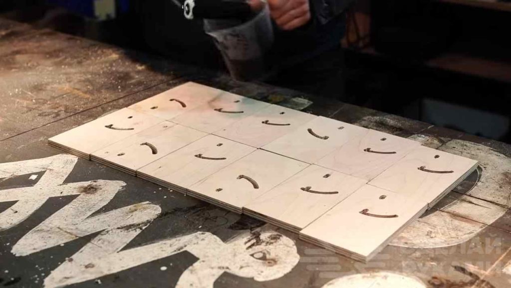 Далее надо напилить заготовки из фанеры: на каждую половинку ящика — по две коротких и по одной длинной. Сверлим в них крепежные отверстия.