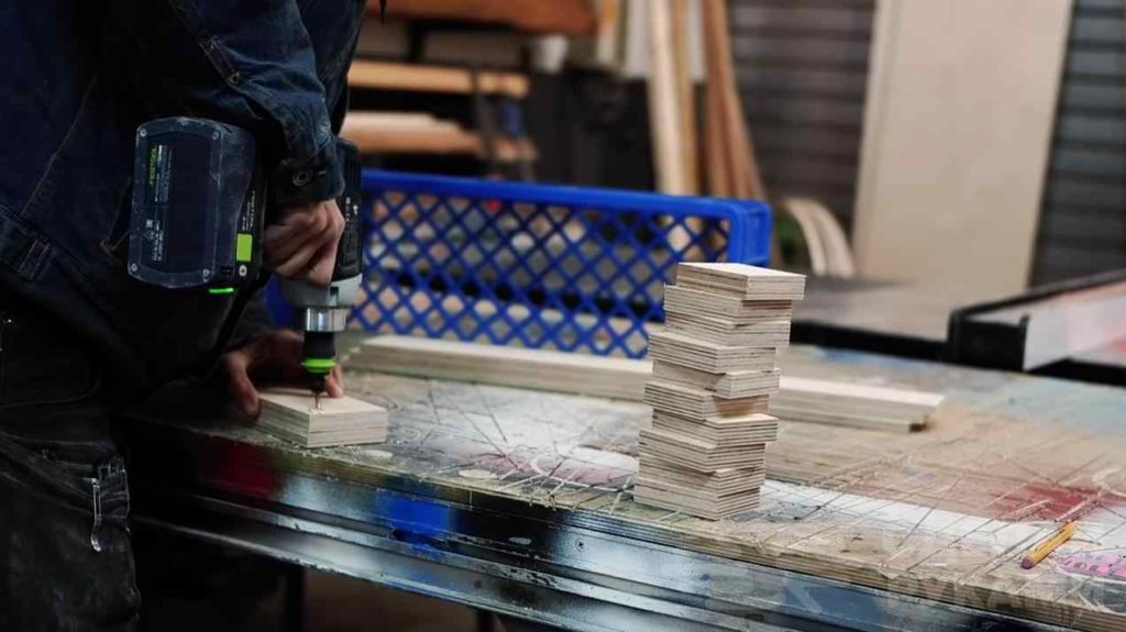 Затем потребуется дополнительно изготовить еще элементы крепления полок. Автор использует для этого фанеры и отрезки металлического уголка. В фанере необходимо сделать пазы, в уголках — сверлим отверстия.