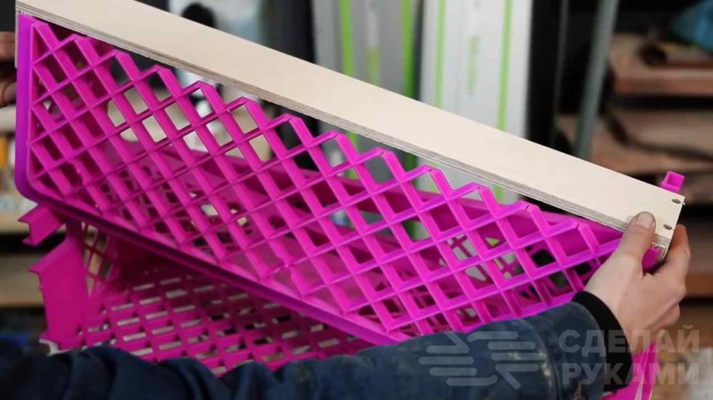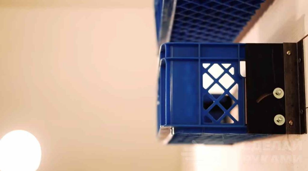 Из пластиковых ящиков (например, из-под овощей) можно сделать своими руками откидные настенные полки. Их можно использовать в домашней мастерской или в гараже — дешево и удобно.