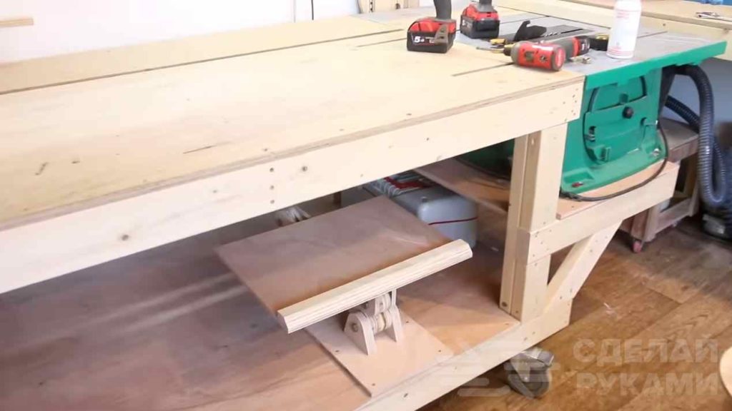 Этот столик адаптирован именно для мастерской — когда он не нужен, то просто складывается под верстак. Очень практично и удобно.